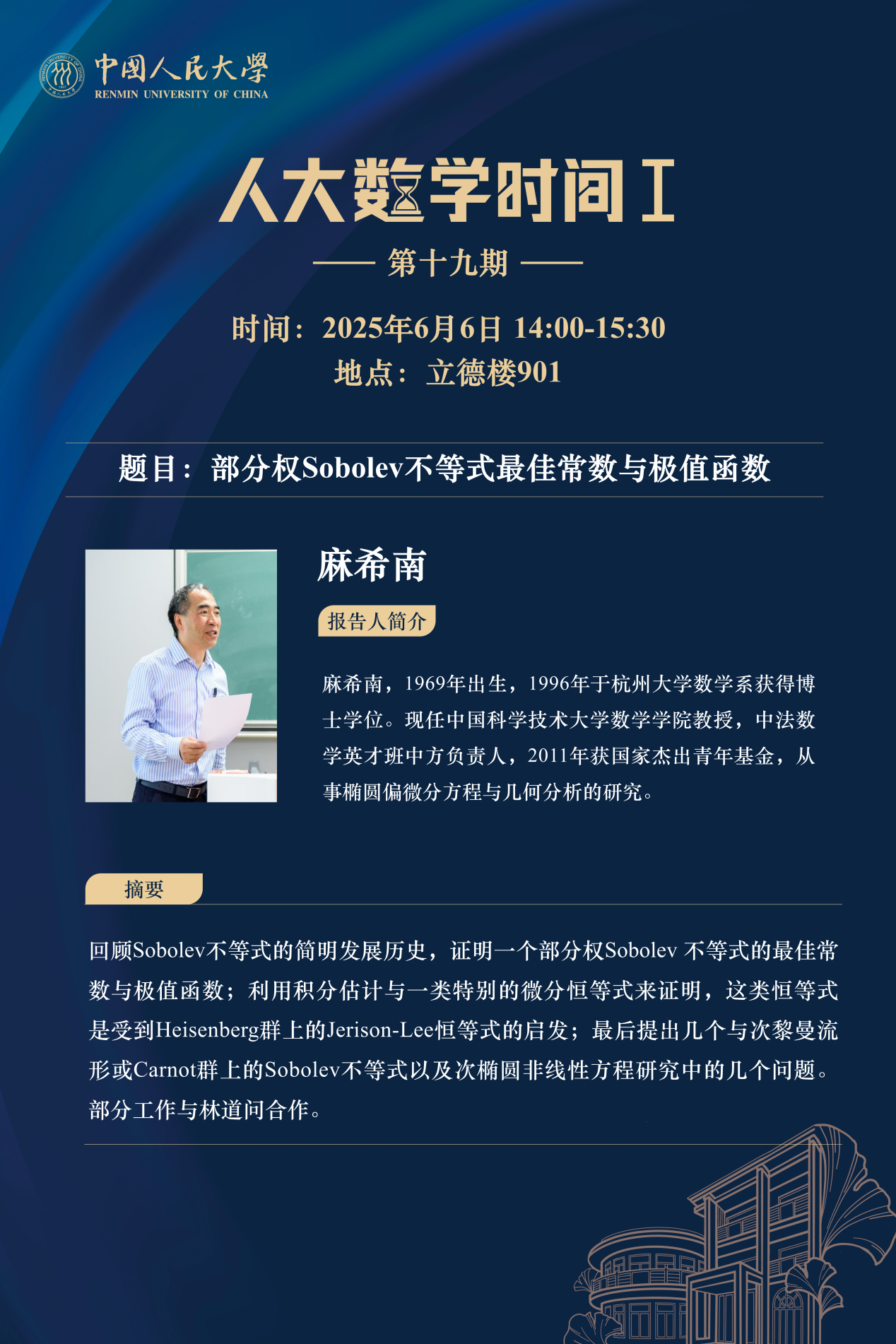 为促进学科交流融合、拓宽师生学术视野、释放科研创新活力,助力pg试玩 学科走向一流,中国人民大学设立“pg试玩 时间”,以专题研讨、高端学术论坛为载体,搭建数学思想充分碰撞、优秀人才不断涌流、创造活力竞相迸发的舞台。“pg试玩 时间”将持之以恒,久久为功,立志通过交流与创新、提出重大问题,引领数学学科及相关领域的创新与发展,成为对我国数学发展有贡献意义的平台。以下为“pg试玩 时间I”第十九期信息: