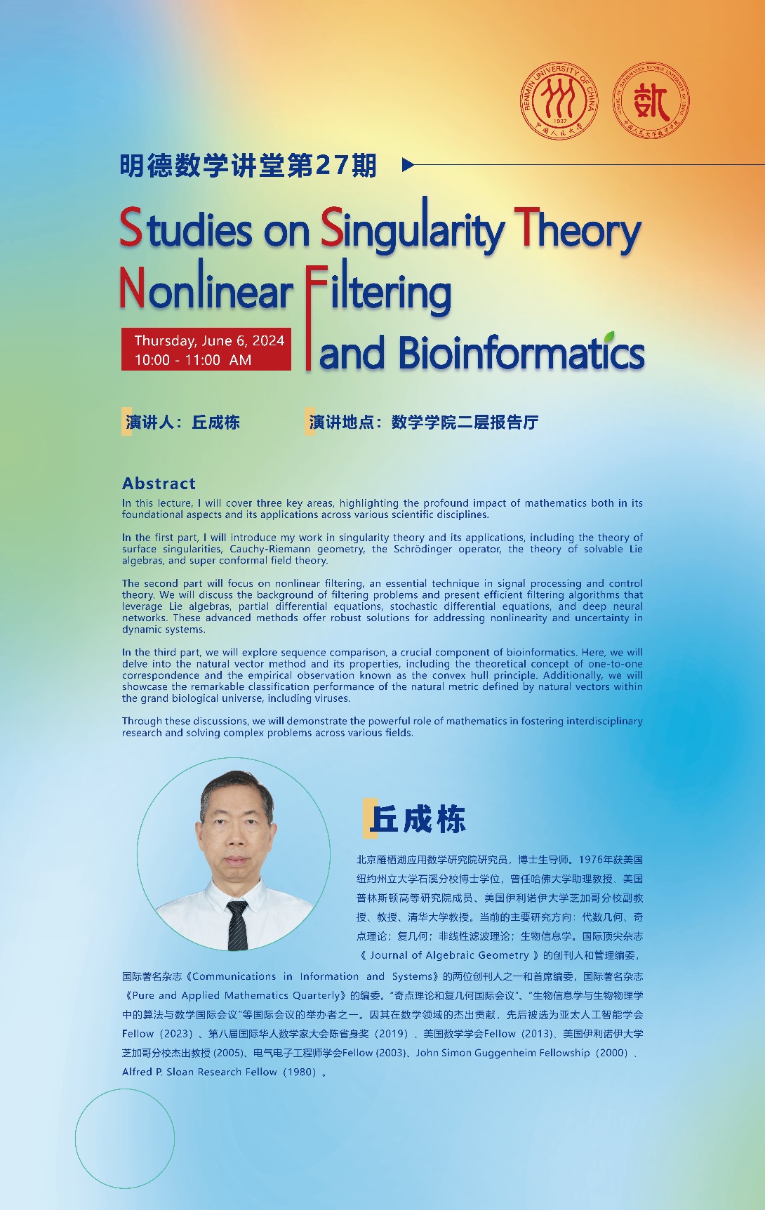明德数学讲堂(二十七)Studies on Singularity Theory Nonlinear Filtering and Bioinformatics