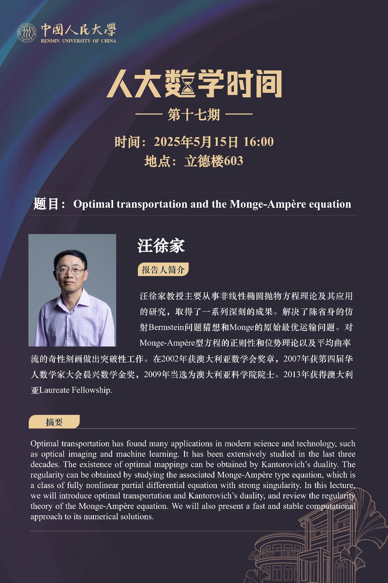 报告人简介:汪徐家教授主要从事非线性椭圆抛物方程理论及其应用的研究,取得了一系列深刻的成果。解决了陈省身的仿射Bermstein问题猜想和Monge的原始最优运输问题。对Monge-Ampère型方程的正则性和位势理论以及平均曲率流的奇性刻画做出突破性工作。在2002年获澳大利亚数学会奖章,2007年获第四届华人数学家大会晨兴数学金奖,2009年当选为澳大利亚科学院院士。2013年获得澳大利亚Laureate Fellowship.