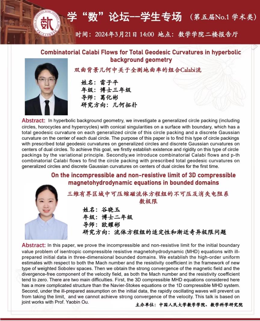 大家好,本届学“数”论坛——学生专场的第一场报告来啦!本场报告类型为学术类,将于2024年3月21日14:00在pg试玩 二楼报告厅举办。主讲嘉宾为博士三年级雷子平同学、博士二年级谷晓玉同学。