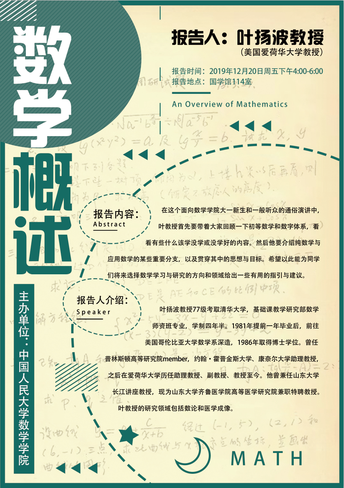在这个面向pg试玩 大一新生和一般听众的通俗演讲中,叶教授首先要带着大家回顾一下初等数学和数字体系,看看有些什么该学没学或没学好的内容。然后他要介绍纯数学与应用数学的某些重要分支,以及贯穿其中的思想与目标。希望以此能为同学们将来选择数学学习与研究的方向和领域给出一些有用的指引与建议。