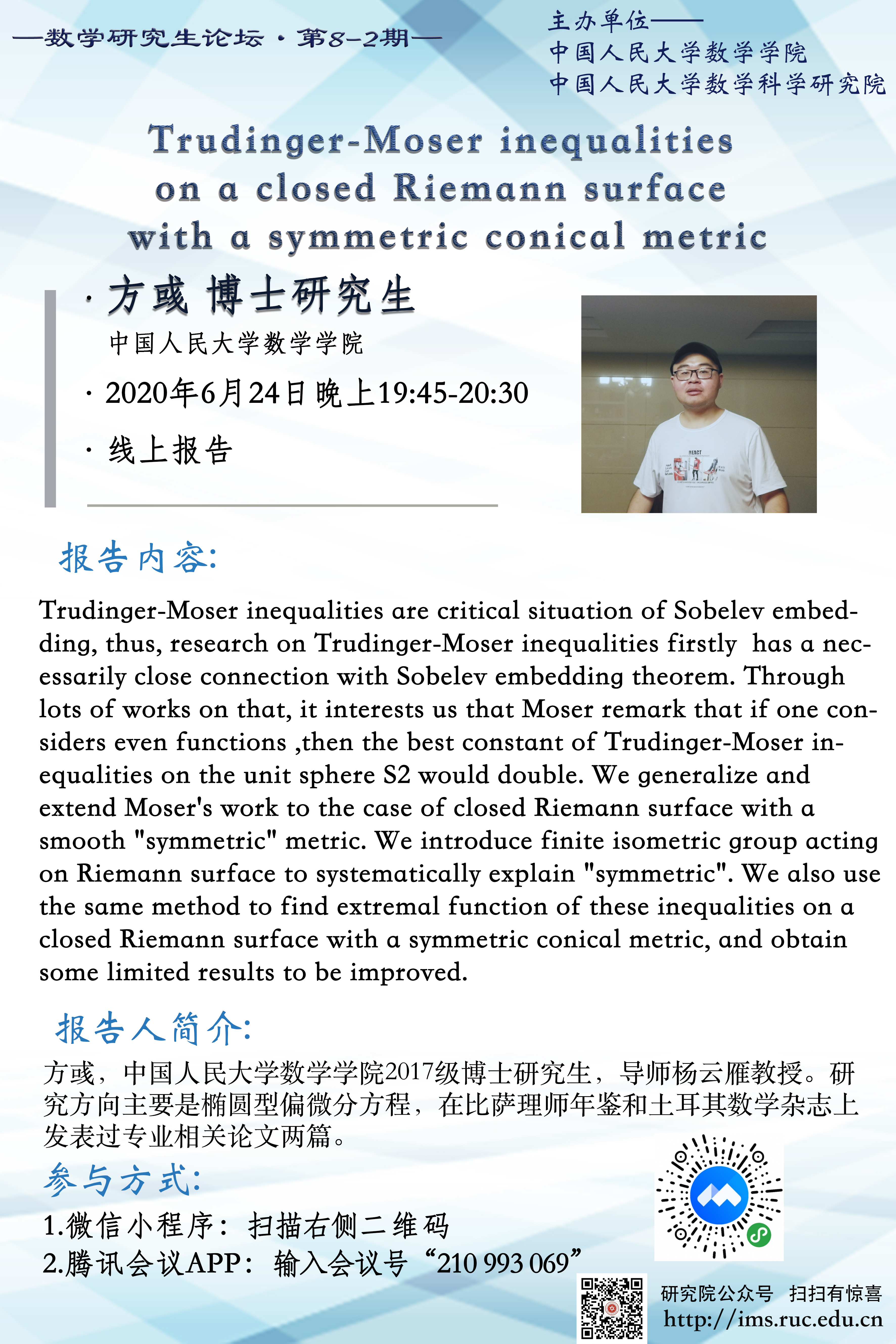 pg试玩 研究生论坛 8-2期—Trudinger-Moser inequalities on a closed Riemann surface with a symmetric conical metric