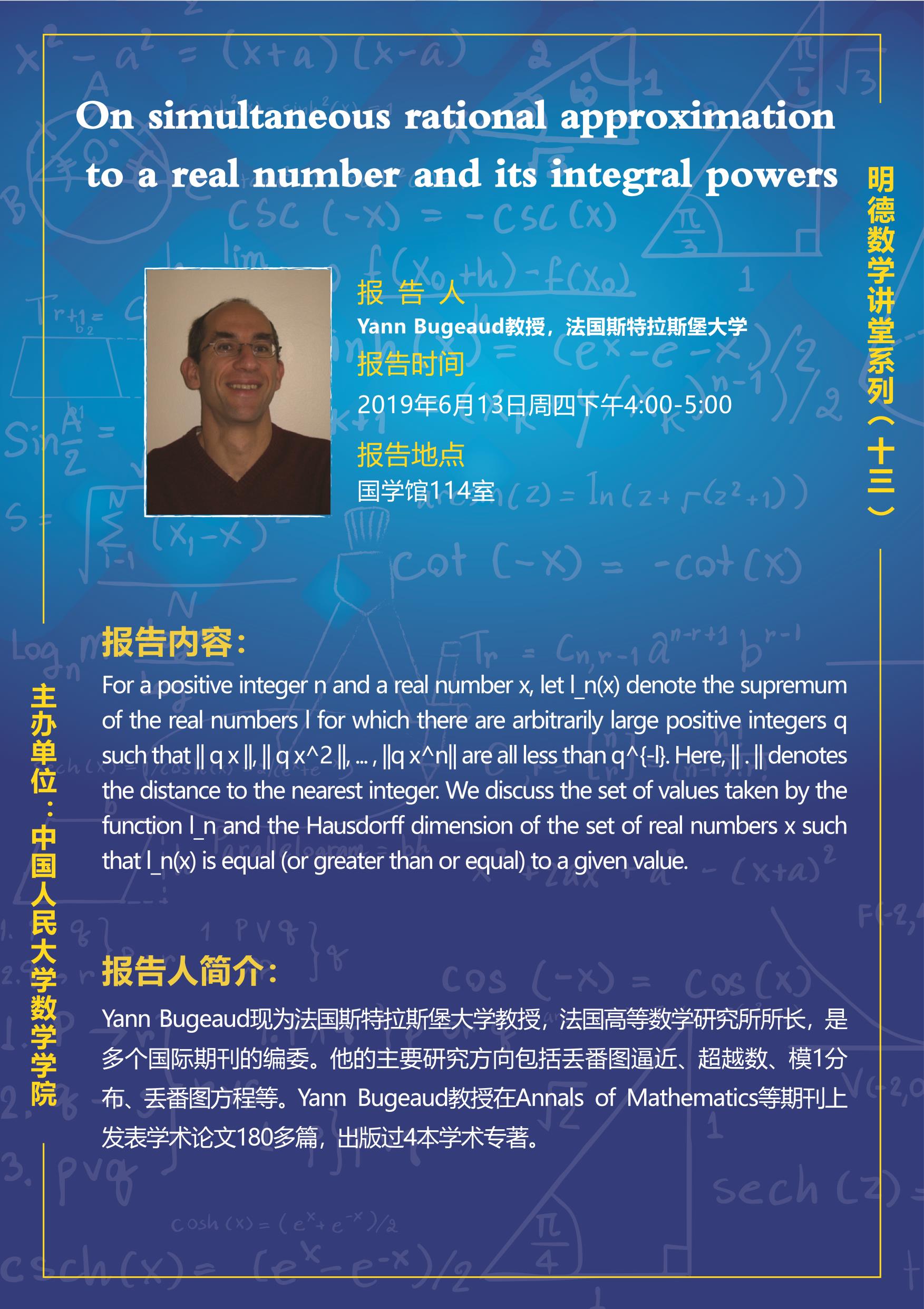 明德数学讲堂系列(十三)Yann Bugeaud教授——On simultaneous rational approximation to a real number and its integral powers