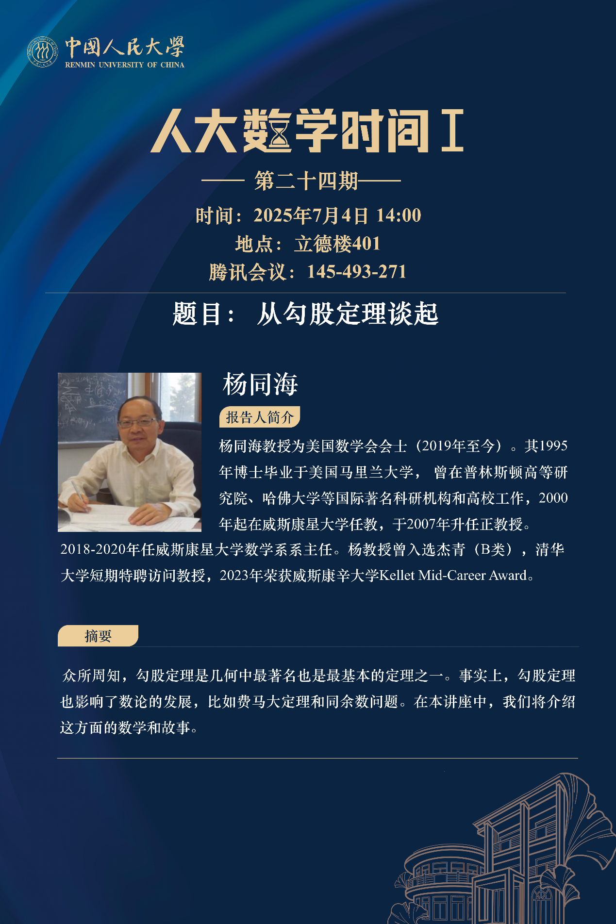 杨同海教授为美国数学会会士(2019年至今)。1995年博士毕业于美国马里兰大学, 曾在普林斯顿高等研究院、哈佛大学等国际著名科研机构和高校工作,2000年起在威斯康星大学任教,于2007年升任正教授。2018-2020年任威斯康星大学数学系系主任。杨教授曾入选杰青(B类),清华大学短期特聘访问教授,2023年荣获威斯康星大学Kellet Mid-Career Award。
