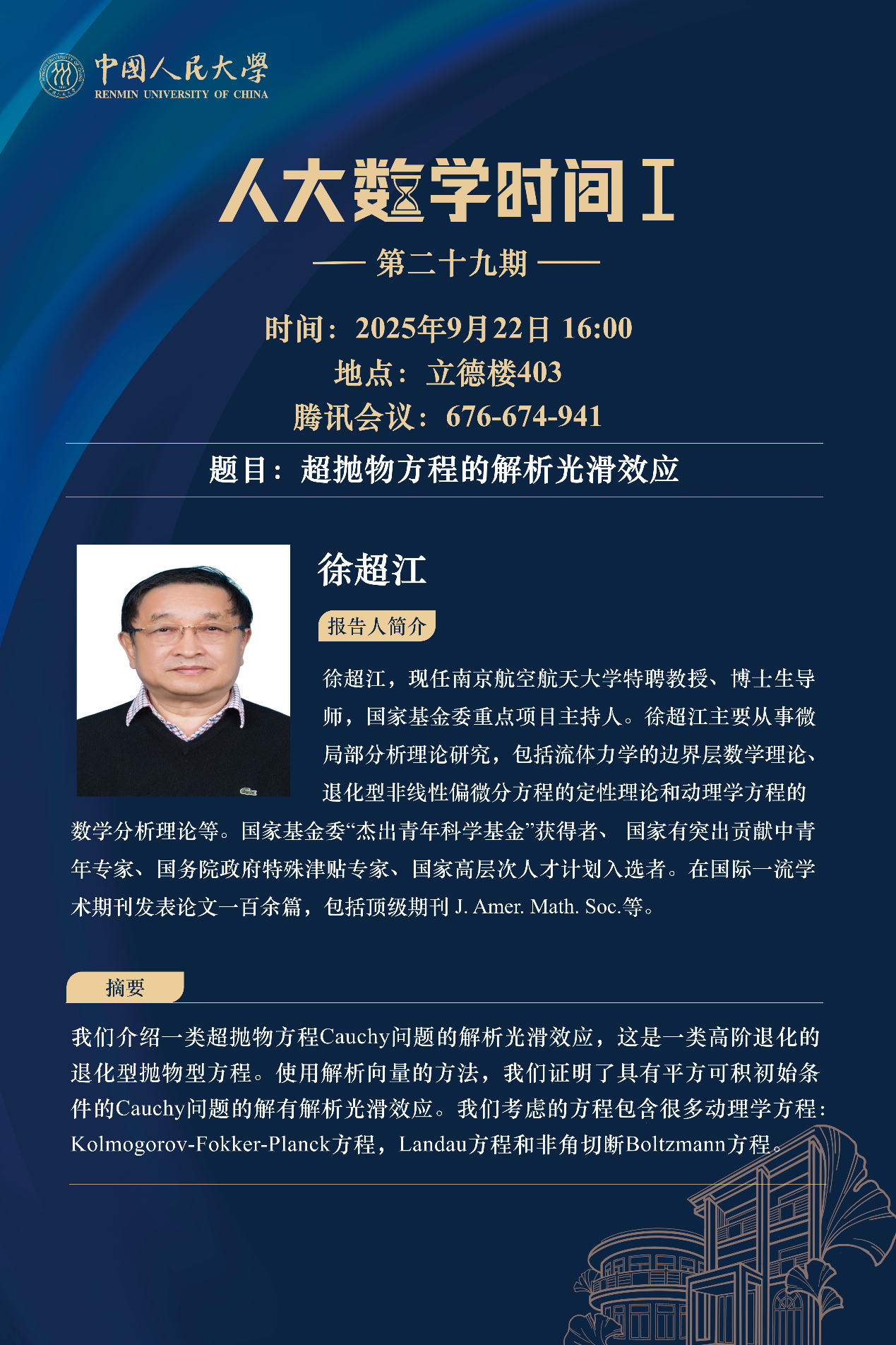 为促进学科交流融合、拓宽师生学术视野、释放科研创新活力,助力pg试玩 学科走向一流,中国人民大学设立“pg试玩 时间”,以专题研讨、高端学术论坛为载体,搭建数学思想充分碰撞、优秀人才不断涌流、创造活力竞相迸发的舞台。“pg试玩 时间”将持之以恒,久久为功,立志通过交流与创新、提出重大问题,引领数学学科及相关领域的创新与发展,成为对我国数学发展有贡献意义的平台。以下为“pg试玩 时间I”第二十九期信息: