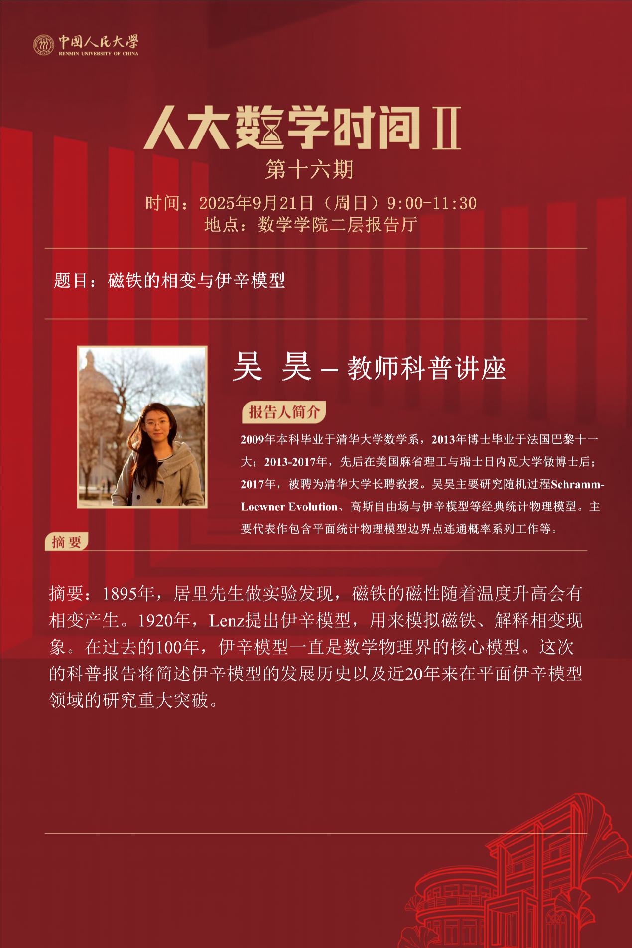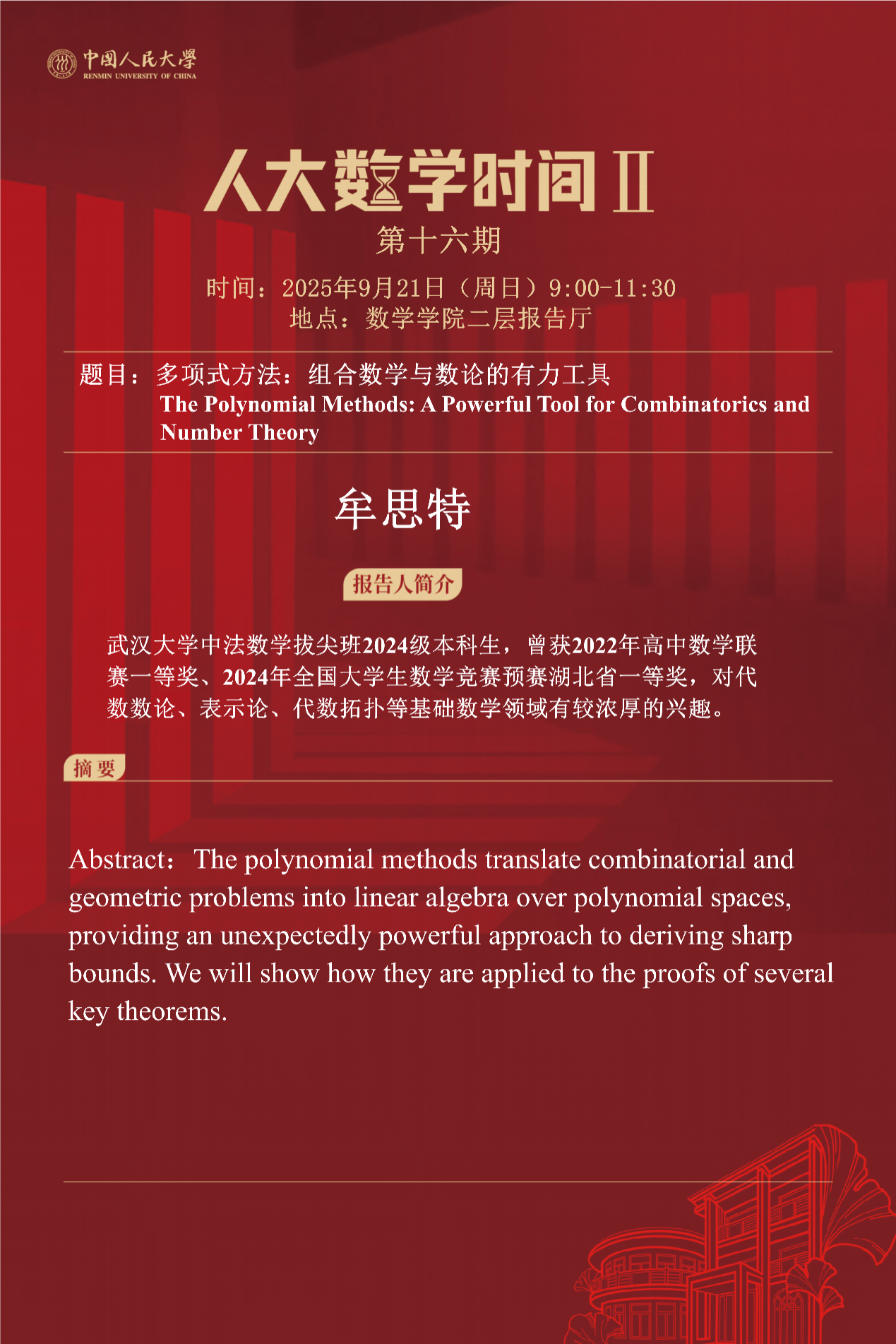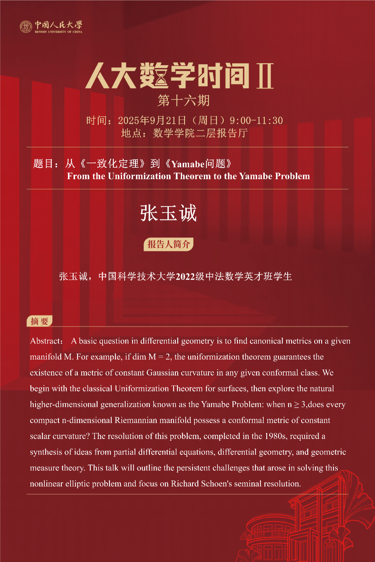 为促进学科交流融合、拓宽师生学术视野、释放科研创新活力,助力pg试玩 学科走向一流,中国人民大学设立“pg试玩 时间”,以专题报告、交流研讨、高端学术论坛为载体,搭建数学思想充分碰撞、优秀人才不断涌流、创造活力竞相迸发的舞台。“pg试玩 时间”将持之以恒,久久为功,立志通过交流、创新、提出重大问题,引领数学学科及相关领域的创新与发展,成为对我国数学发展有贡献意义的平台。