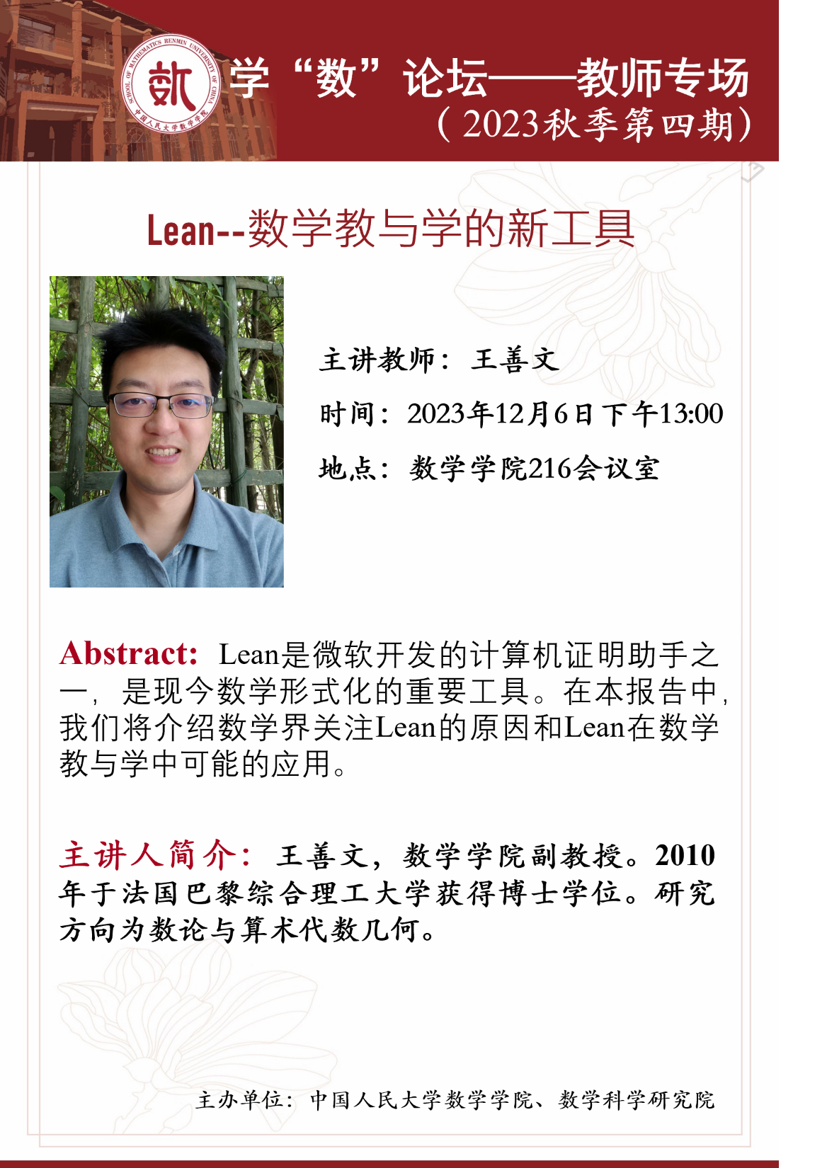 教师专场的第三期报告将于2023年12月6日下午13:00在pg试玩 216会议室举行,本场报告的主讲教师为王善文,报告题目为《Lean--数学教与学的新工具》。