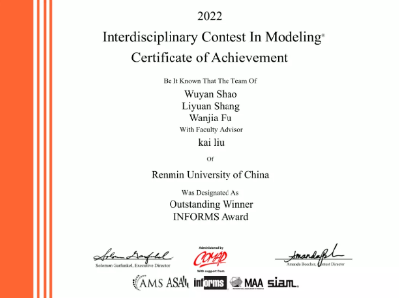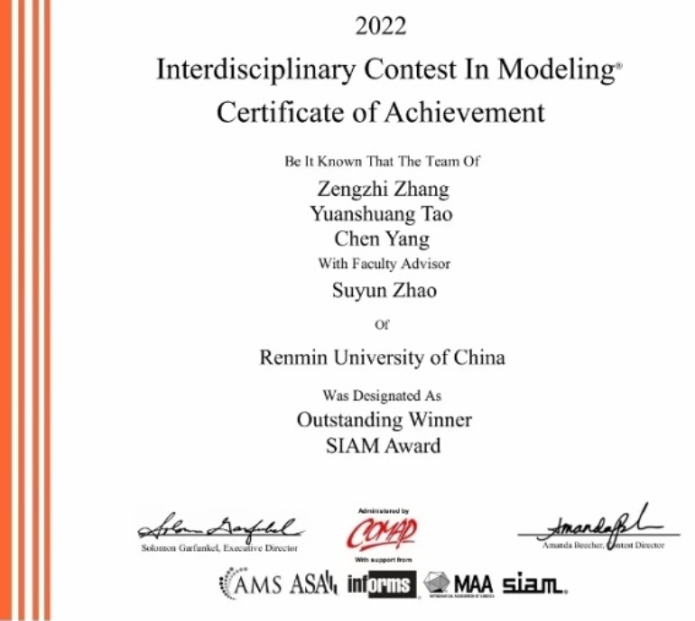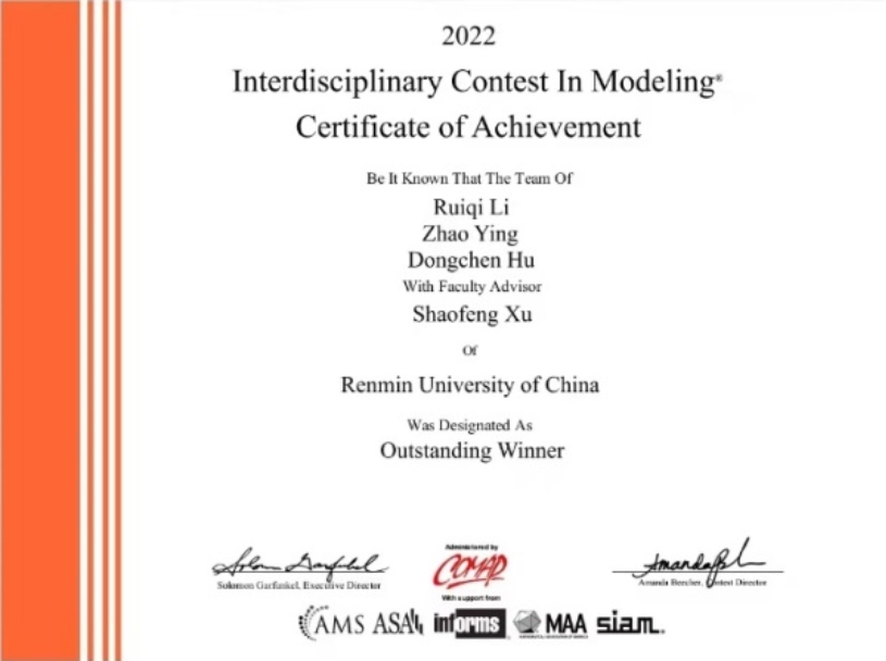 2022年美国大学生数学建模竞赛(MCM/ICM)结果日前揭晓,中国人民大学共有103支参赛队伍获奖,取得了非常可喜的成绩。全球共评出特等奖(Outstanding Winner)44组,获奖比例仅为0.16% (<1%)。但是,我校学子克服困难,勇攀高峰,共有3支队伍获得该奖项,是全球获得特等奖数量最多的高校!此外还有6支队伍获得特等奖提名(Finalists Winner),24支队伍获得一等奖(Meritorious Winner),70支队伍获得二等奖(Honorable Mention)。财政金融学院的张增智、陶芫塽和杨晨组成的团队获特等奖,同时还问鼎了美国工业与应用数学学会特别奖(SIAM Award,简称SIAM奖)。美国工业与应用数学学会奖(SIAM Award)是美国工业与应用数学学会自1988年开始在美国大学生数学建模竞赛中设立的奖项,该奖被认为是数学建模竞赛中的最高奖项之一。自设奖以来,获奖团队大多来自世界一流大学,如哈佛大学、麻省理工学院、加州理工大学。在此之前中国高校获得此奖的有清华大学、浙江大学、武汉大学、华中科技大学等十余所高校。我校在去年实现零的突破的基础上,今年连续获得SIAM奖。统计学院邵午言、劳动人事学院尚丽源以及统计学院付萬嘉组成的队伍也获得特等奖,同时还获得国际运筹学与管理科学冠名奖(INFORMS Award)。经济学院李睿齐和财政金融学院的赵莹、胡东辰组成的团队也获得了特等奖。这是我校自参加美赛以来获得特等奖数量最多的一年。值得一提的是,我校中法学院也有三组同学获得一等奖,一组同学获得二奖项,这是中法学子的历史最好成绩!祝贺所有获奖的同学们!
