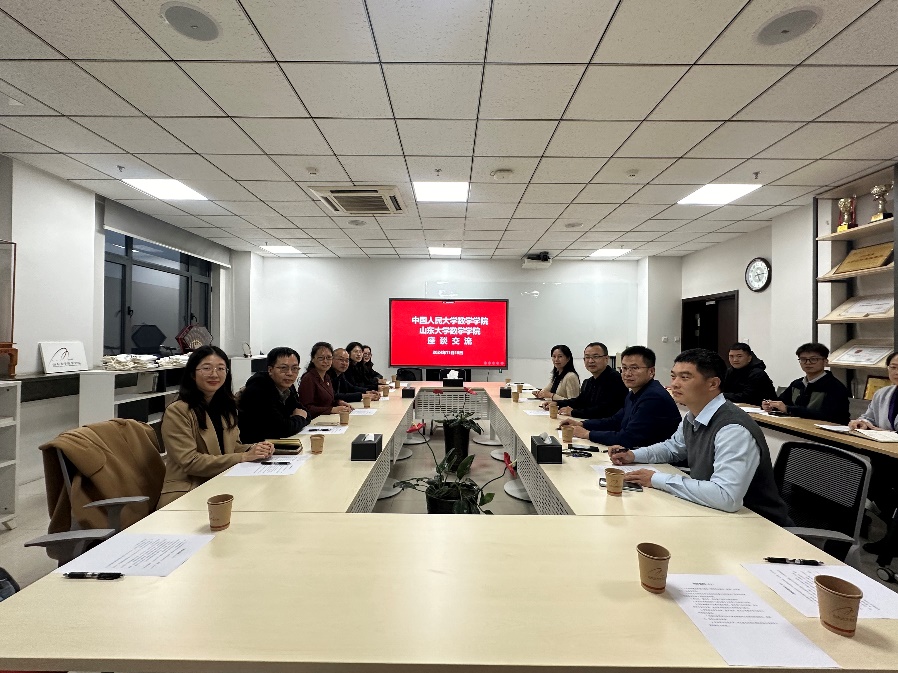 11月15日,pg试玩 党委书记柯媛元、副院长黄志勇、数学与应用数学系党支部书记朱晓宝、宣传干部周中帆、本科教务秘书赵春晓、团委副书记缪亭如一行前往山东大学pg试玩 开展调研交流。山东大学pg试玩 党委书记王光辉、常务副院长胡锡俊、党委副书记王苗雨、张艳强、本科教务秘书刘京慧、学生工作办公室主任桑军帅、团委副书记朱云龙、辅导员戚学儒参加调研座谈。