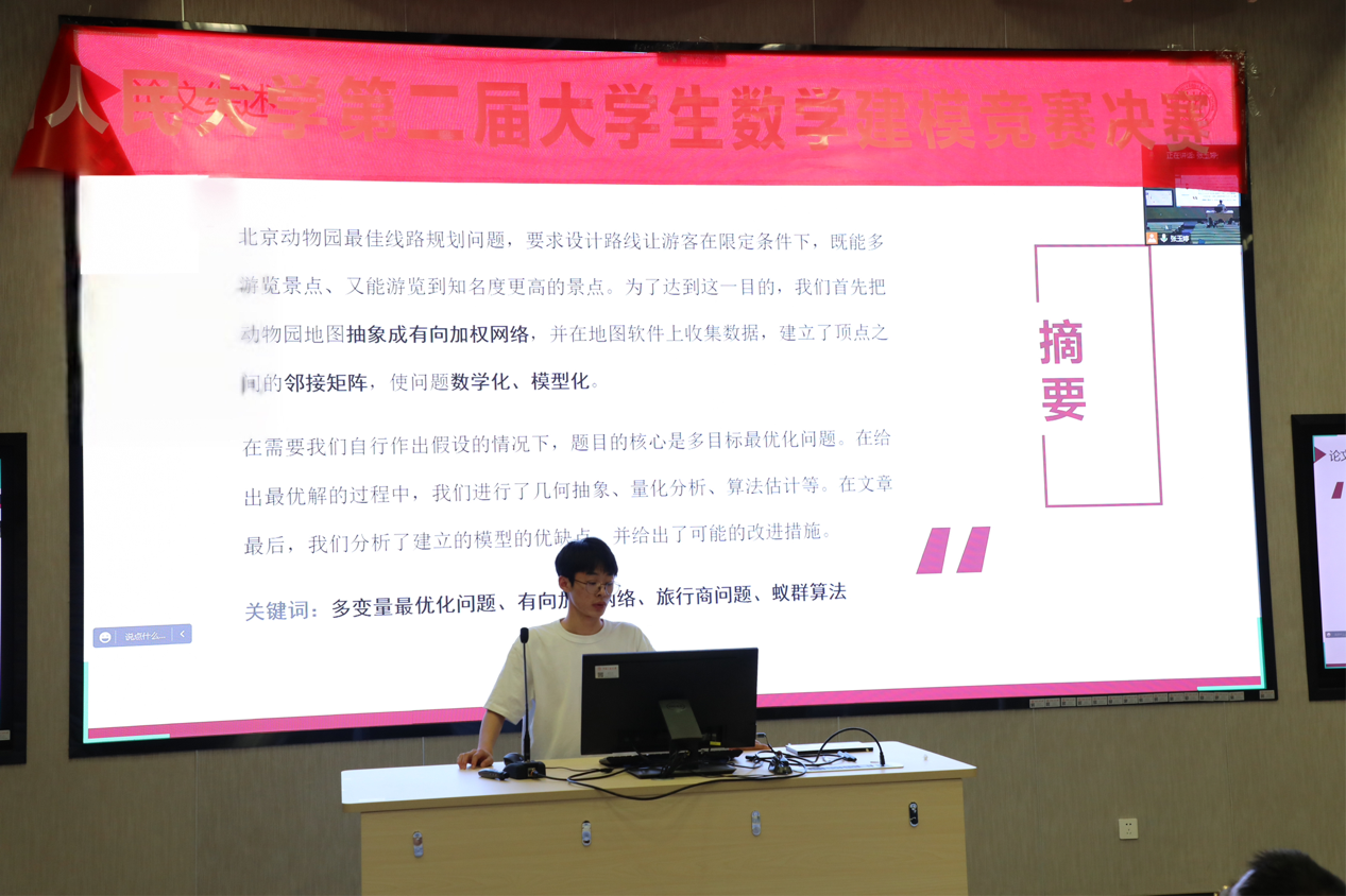 为增强我校学习氛围,提高学生建立数学模型和运用计算机技术解决实际问题的综合能力,以及为即将到来的全国大学生数学建模竞赛与全国研究生建模竞赛做好备战准备,中国人民大学pg试玩 数学建模竞赛组委会特举办中国人民大学第二届大学生数学建模竞赛。该竞赛由pg电子试玩平台 研究生会承办,并于6月7日在教一1302举办决赛。全校共有36组队伍报名参赛,从中脱颖而出的6组队伍跻身决赛,这些优秀学子分别来自6个不同的学院,最终相聚于决赛并展开激烈角逐,经评比得出一、二等奖各一名,三等奖两名,优秀奖两名。