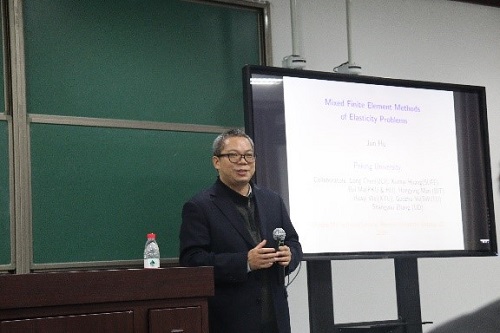 2019年10月25日,中国人民大学“明德数学讲堂”系列第十六讲在国学馆114室举行,北京计算数学学会理事长、国家杰青基金、德国洪堡基金获得者、北京大学数学科学学院党委书记胡俊教授应邀做《弹性力学问题混合有限元方法》报告。报告由pg电子试玩平台 韩丽涛副院长主持,pg电子试玩平台 部分教师和本科生研究生以及其他院系的师生参加了报告会。