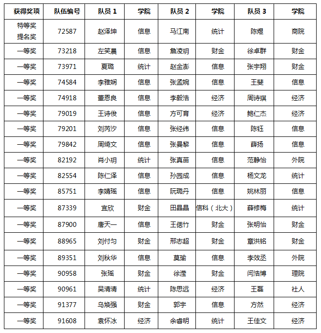 在中国人民大学所有参赛队伍中,共有60支队伍获奖。其中赵泽坤(信息学院),马江南(统计学院)和陈煜(商学院)三位同学组成的队伍获得特等奖提名奖(Finalist,Winner,全球前23名),是继2014、2016年之后,第三次荣获该奖项。我校获一等奖队伍数由2017年的13支队伍,增长至18支队伍,取得较大的进步,另有41支队伍获得二等奖,获奖队伍数连续增长。