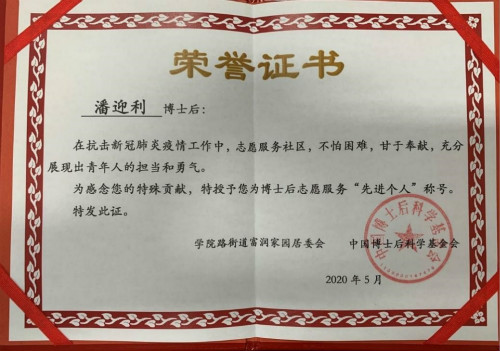 潘迎利博士于2018年9月进站,他在站期间思想上积极要求进步,科研成果突出,教学优秀。上半年疫情期间,他在所居住的富润家园博士后公寓,积极参与抗击新冠肺炎疫情工作,志愿服务社区,不怕困难,甘于奉献,充分展现出人大pg试玩 青年教师的担当和勇气。