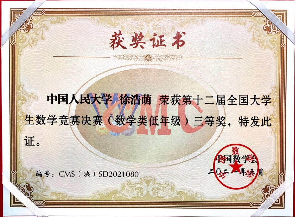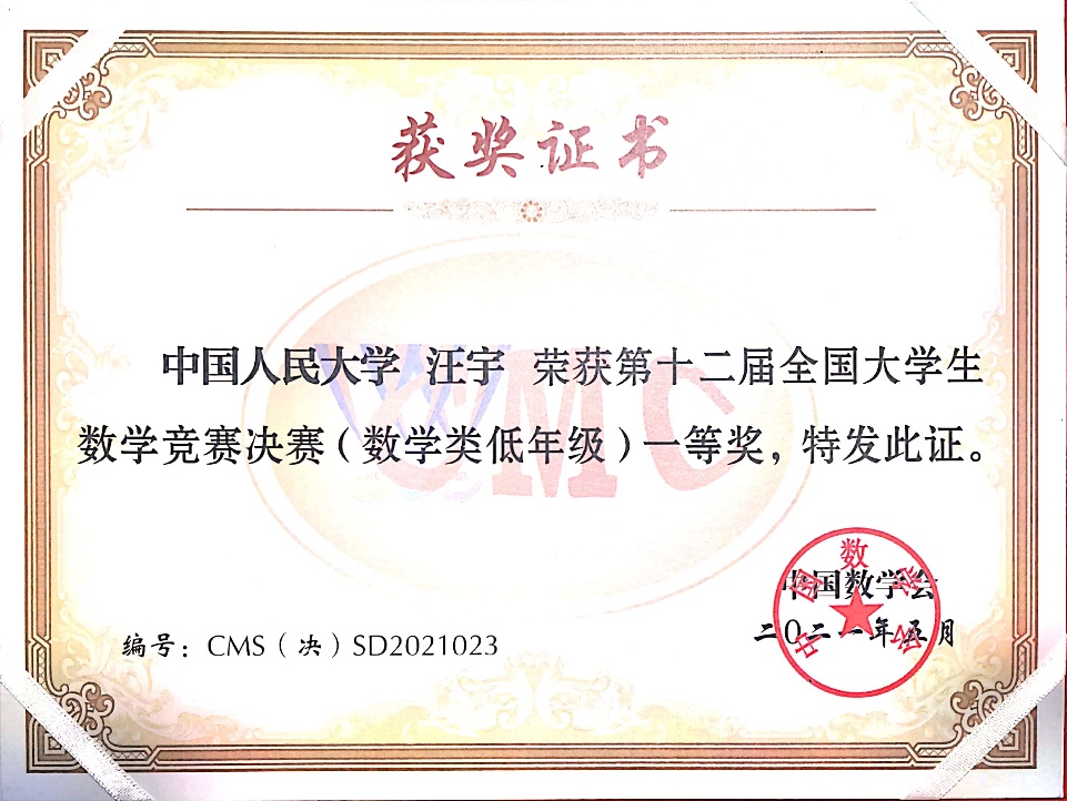 第12届全国大学生数学竞赛决赛于2021年5月16日在吉林大学成功落下帷幕。本次竞赛全国共有32个赛区206921人报名参加初赛,从中选拔出668人进入决赛,实际参赛人数646人,其中,数学专业组343人(高年级组223人,低年级组120人),非数学专业组303人。pg电子试玩平台 2019级数学拔尖人才实验班的汪宇同学和徐浩萌同学晋级北京赛区全国总决赛(北京赛区共28名学生入围),并在此次决赛中获得优异成绩,其中汪宇同学获得低年级组全国一等奖(全国共24名同学获得该等级奖),徐浩萌同学获得低年级组全国三等奖(全国共59名同学获得该等级奖)。这是我校第二次组织全校本科生参赛,首次入围全国总决赛并获得优异成绩,这份喜人的成绩必将激励更多我校本科生积极参赛。