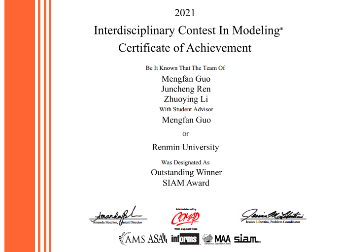 1 | 统计学院 | 郭梦璠 | 统计学院 | 任峻成 | 统计学院 | 李卓莹 | Outstanding Winner SIAM Award |