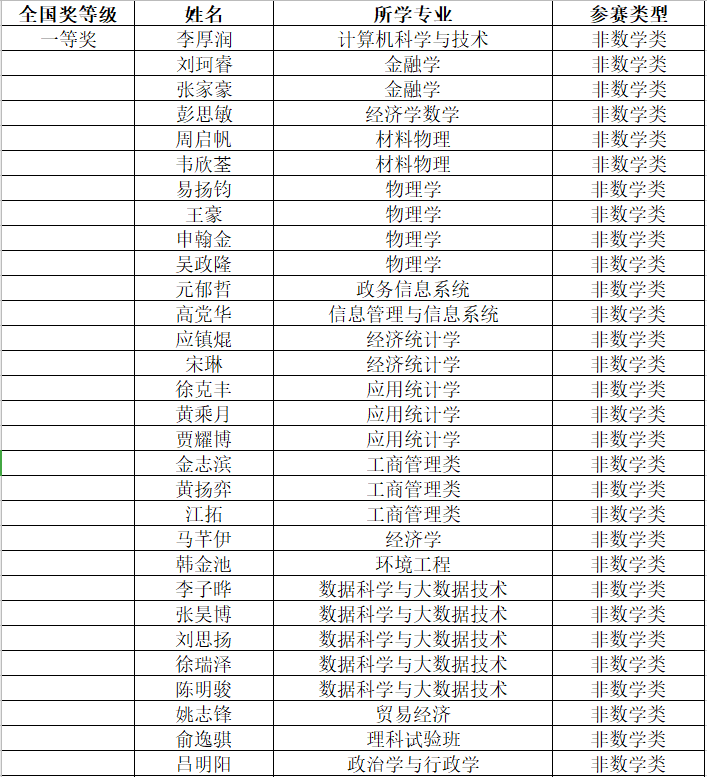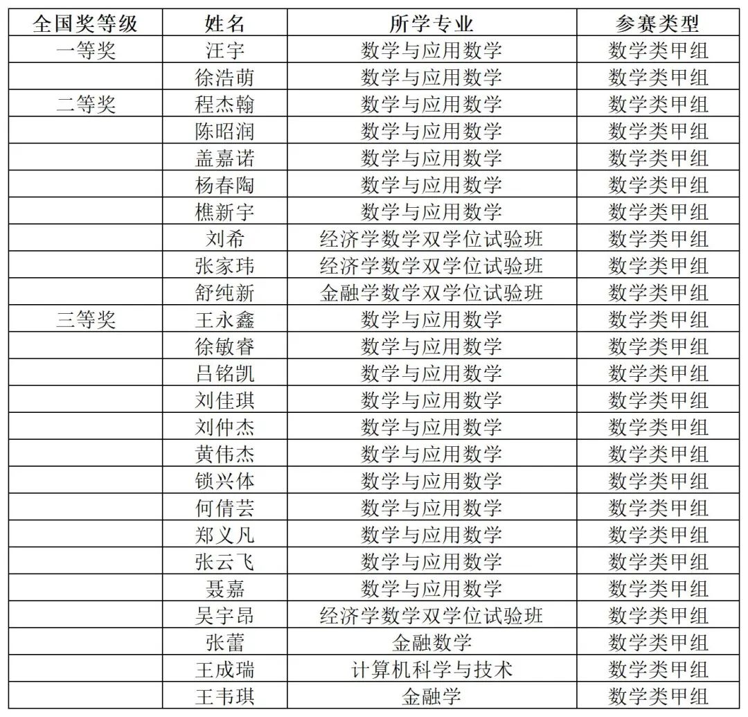 特别需要指出的是我校数学类A组成绩十分喜人,2名来自pg试玩 2019级数学拔尖人才实验班的同学,以优异成绩跻身28名北京赛区全国总决赛名单中,充分展示了我校pg试玩 本科学生的专业实力。