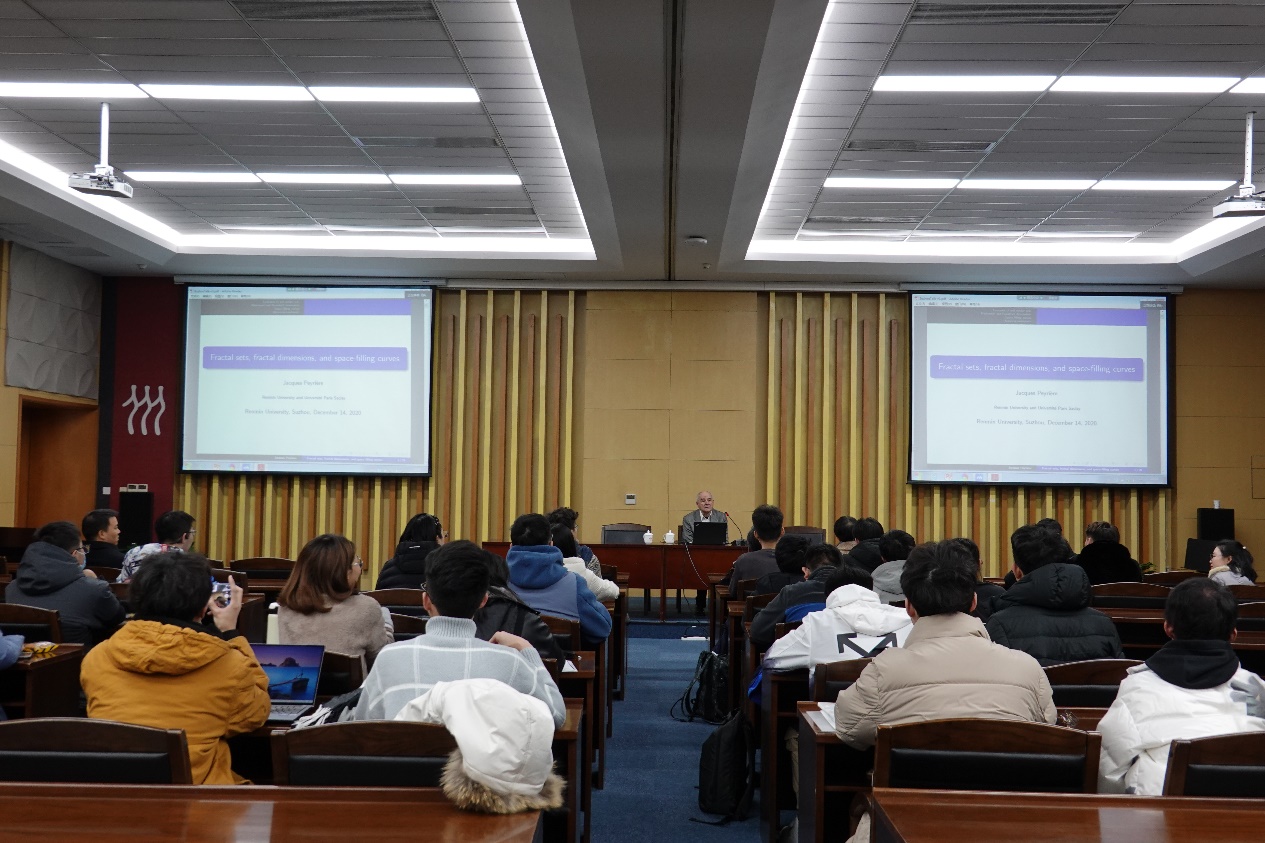 2020年12月14日上午,pg电子试玩平台 《科技部高端外国专家引进计划》学者JacquesPeyrière教授在中国人民大学苏州校区修远楼为中法数学实验班学生及苏州校区师生作了题为《Fractal Sets, Fractional Dimensions, and Space-filling Curves》(分形集、分形维数以及空间填充曲线)的报告。报告由朱来义教授主持,中国人民大学中法数学实验班全体学生以及相关专业师生参加了报告会。