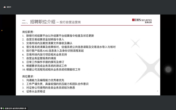 星展证券(中国)有限公司人力资源经理崔欣雨从公司的历史、pg试玩和经营许可项目等方面展开介绍,星展证券践行“P(崇高使命),R(团队合作),I(勇于创新),D(果断负责), E(乐在星展)”的原则和价值观,聚焦客户,拥抱变革,依托星展集团境内外金融资源和渠道优势,持续赋能企业,为客户提供全方位资本市场服务。接着,崔经理着重介绍了投行自营运营岗和投资银行执行岗的职责和要求,并从HR的角度给了一些应聘过程中的小tips。