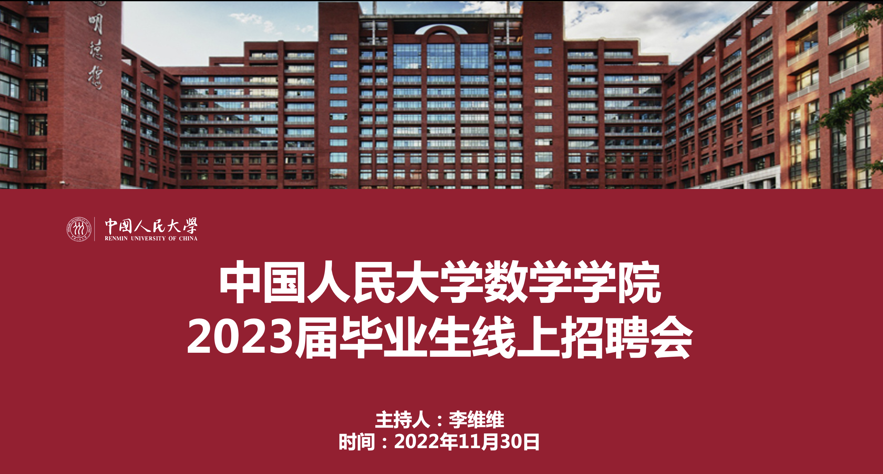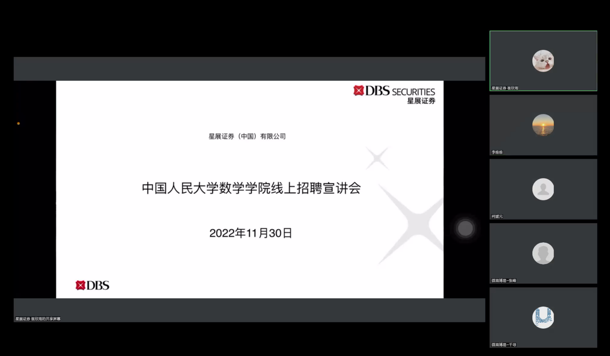 2022年11月30日下午,pg电子试玩平台 2023届毕业生线上招聘会顺利召开。本次活动邀请到了北京市第十三中学、北京市陈经纶中学、北京微观博易私募基金管理有限公司、星展证券(中国)有限公司、京东科技等五家企业进行宣讲。学院党委书记柯媛元老师,党委副书记沈健老师,团委书记李慧老师以及pg试玩 的本硕博同学出席。本次会议由李维维同学主持。
