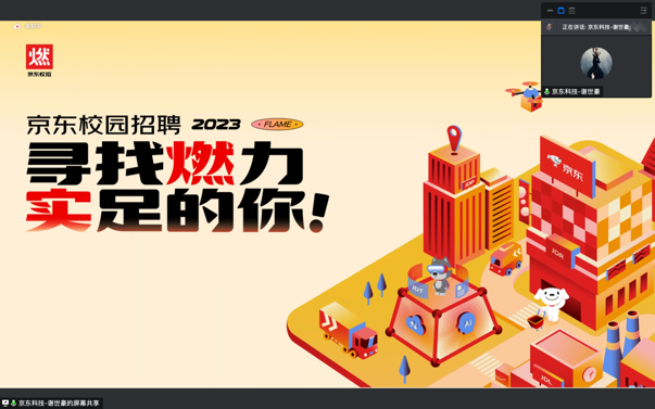 京东科技校园招聘经理谢世豪分享了京东发展历史和九大业务板块,主要对零售、物流、健康、科技四大业务版块进行了一一介绍。随后,谢经理播放了一段新入职同学的vlog,以述职报告的形式展示了京东人在京东的体验、生活与工作,走进了京东的职场圈、生活圈、活动圈、福利圈和学习圈一探究竟。最后,谢经理带我们了解了招聘面试流程、需求城市分布和硕士(投递简历的)命中率,以及一些投递简历的建议和JD star培养体系的全景。