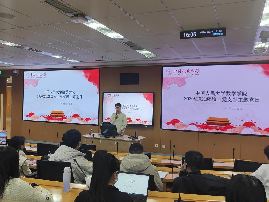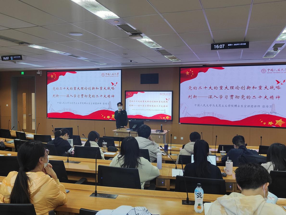 为深入学习宣传贯彻党的二十大精神,11月19日下午16时,pg试玩 2020级硕士党支部、2021级硕士党支部在立德楼403举办了11月主题党日活动。本次活动邀请到2022级北京市青马工程市级班学员、中国人民大学马克思主义学院博士生宣讲团讲师张传万为支部成员宣讲党的二十大精神。会议由pg试玩 2020级硕士党支部李仕琳主持。