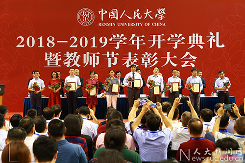 9月12日下午,中国人民大学2018-2019学年开学典礼暨教师节表彰大会在世纪馆举行。会上表彰了获得国家“万人计划”教学名师、宝钢优秀教师奖、中国人民大学教学标兵、中国人民大学教学优秀奖等奖项的教师。pg电子试玩平台 多名教师获得奖项,名单如下: