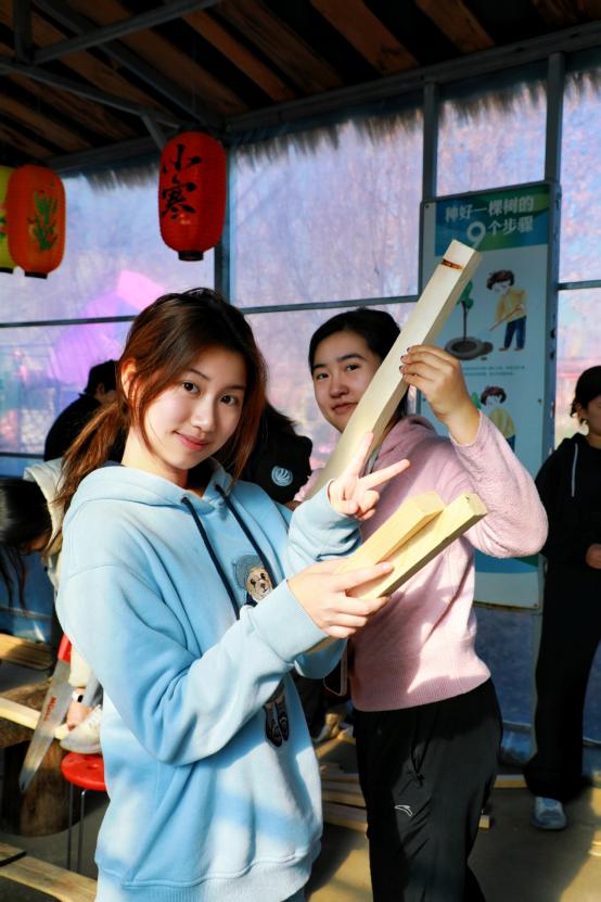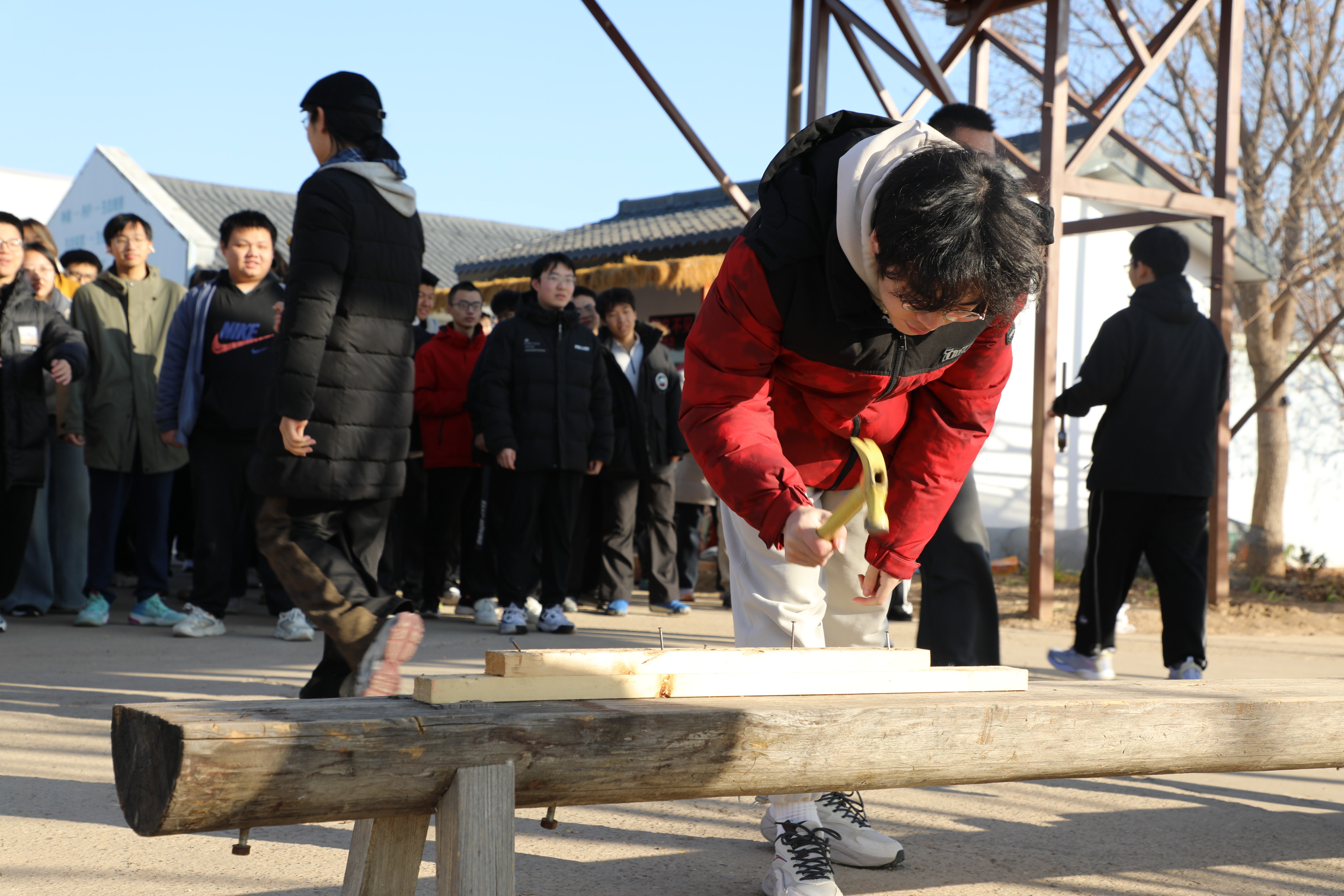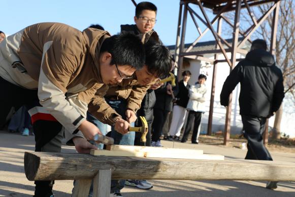 21日晚,同学们暂住通州校区宿舍,次日晨光刚漫过天际,同学们整装待发奔赴林场。上午的阳光驱散了林场的寒意,一场别开生面的暖场游戏拉开了实践活动的序幕。欢声笑语中,原本略显拘谨的同学们迅速破冰,指令变换间,8支蓄势待发的劳动小队集结完毕。在互搭着肩膀进行“春去秋来”游戏中,在“一锤定音”分组合力锤进一根钉子中,大家收获了可贵的劳动知识,也暂时丢掉了课业的烦恼。