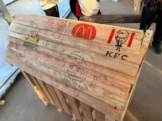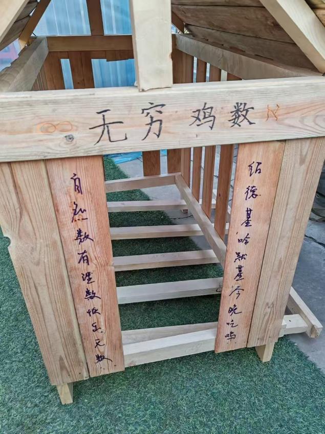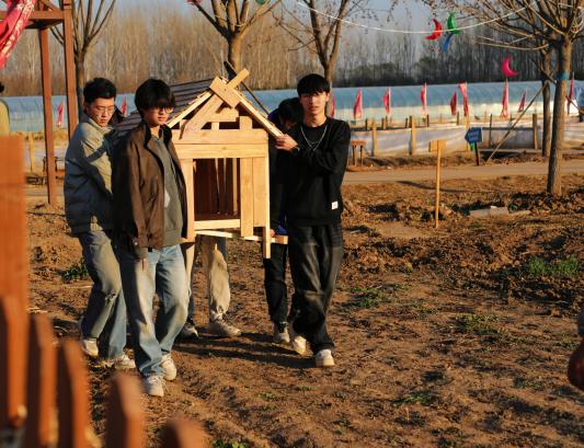 从散乱的木条到成型的框架,从摇摇晃晃到稳如泰山。大家跨在梁上、蹲在泥地里,顾不上衣角的木屑与额头的汗水。数小时的鏖战后,8座崭新的木质鸡舍在草坪上列队成阵,在夕阳下泛着金色的光泽,宛如一组完美的几何模型,静待“新住户”的乔迁。原本朴素的木窝,在密密麻麻的签名与涂鸦中,成为承载集体美好记忆的专属作品。