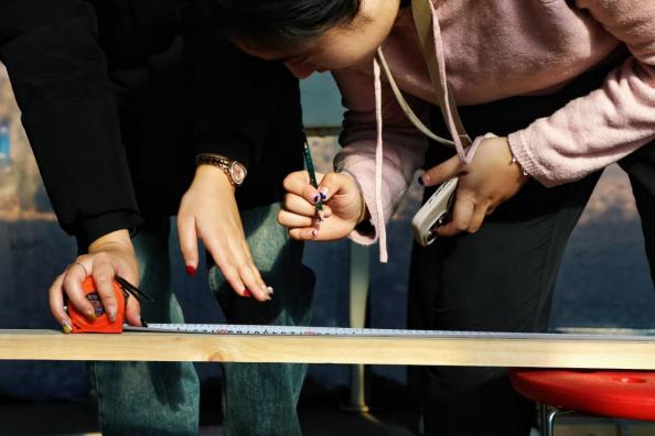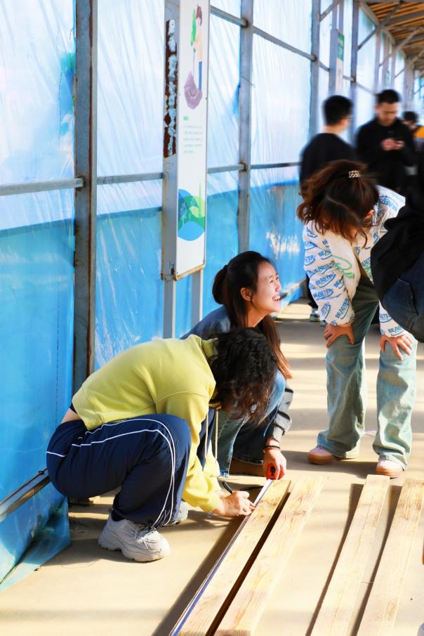 图纸铺开,木料进场,一场“从二维图纸到三维建筑”的建模正式开始。这是一场并未彩排的“交响乐”:锯条摩擦木板的沙沙声如春蚕食叶,羊角锤敲击钉子的笃笃声似鼓点催征,小组成员间的呼喊与商讨声此起彼伏。在数学人的眼中,木工不仅仅是力气活,更是精密的计算。看,那位同学正半跪在地,手中的卷尺绷得笔直,铅笔在木料上留下的每一道划痕都经过了反复校对,将“严谨”二字刻进了木纹里。