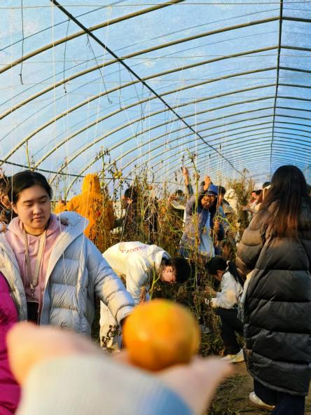 暂别木工场,同学们又转身投入到另一场“战斗”——清理番茄秧。初冬的田野里,枯萎的秧苗虽已褪去夏日的繁盛,根系却依旧顽强地抓紧大地。枯萎的西红柿苗蜷在架上,同学们蹲身小心翼翼拔起残株,架间藏着小西红柿,青中泛着浅红的小果子攥在手里,咬开时带着清甜,汁水不算饱满却透着自然鲜气。一天的辛劳,在这一口原生态的滋味里,化作了清爽的回甘。同学们俯下身姿,双手探入微凉的泥土,用力拔起深扎的残根。每一次弯腰,都是对土地的致敬;指缝间沾染的泥土,成了这堂劳动课最质朴的勋章。大家在清理残枝的同时,也理顺了心绪,体会着“春生夏长,秋收冬藏”的自然韵律。