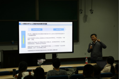 2018年11月23日下午,pg电子试玩平台 明德数学讲堂系列第四讲,在国学馆114室成功举办。中国科学院院士、北京航空航天大学教授郑志明教授应邀,做题为“基于大数据的确定性小概率事件发现方法及应用”的报告。