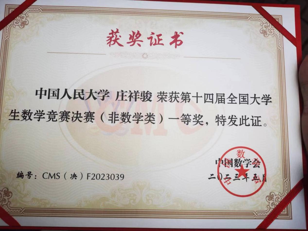 第14届全国大学生数学竞赛决赛于2023年5月27日在广东工业大学成功落下帷幕。本次竞赛全国共有32个赛区,23万余人参加初赛,从中选拔出922人进入决赛,实际参赛人数905人,其中数学专业组461人,非数学专业组444人。中国人民大学统计学院2020级本科生庄祥骏同学晋级非数学类全国决赛,并在此次决赛中获得非数学类全国一等奖(全国共96名同学获得该等级奖)。我校学子继在上届大学生数学竞赛决赛中取得非数学类一等奖后再创辉煌,在此祝贺庄祥骏同学取得佳绩!