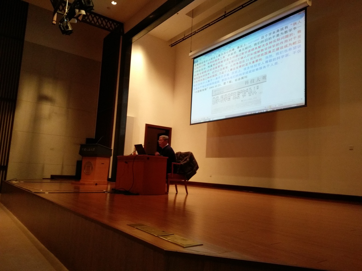 2016年11月23日下午,中国人民大学通识教育大讲堂:数学名师讲座系列(五)在国学馆报告厅成功举办。应我校数学系和数学科学研究院邀请,北京理工大学叶其孝教授做了题为“数学:科学的王后与仆人”的报告。通识教育大讲堂“数学名师讲座系列”由中国人民大学教务处、信息学院数学系、数学科学研究院联合举办,中国人民大学科协协办。信息学院副院长柯媛元教授主持了本次讲座,数学系副主任韩丽涛副教授、数学科学研究院龚新奇副教授、向田老师等数十人参加了此次活动。